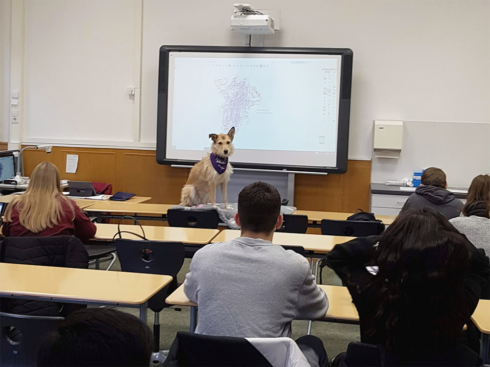 Meine Besitzerin ist Bio- und Medizinlehrerin an der LES und hat mit mir an den Wochenenden eine 90-stündige Ausbildung zum Schulhundeteam absolviert. Für die theoretische Abschlussprüfung musste sie ziemlich viel lernen, mich bei verschiedenen Behörden melden und eine Konzeption schreiben, außerdem wurde ich mehrmals bei der Zusammenarbeit mit Kindern gefilmt und analysiert und musste eine praktische Prüfung bestehen.