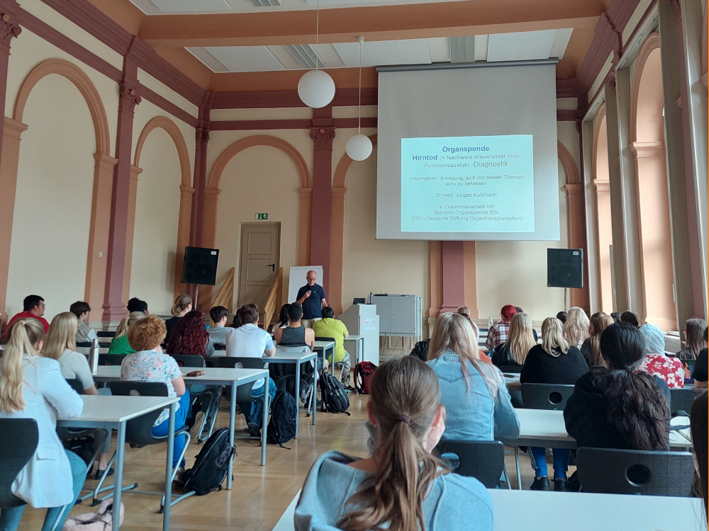 Am 12.06.2024 fand in unserer Aula eine Veranstaltung zum Thema "Organspende" statt. Organisiert wurde die Veranstaltung von Frau Besser, Auszubildende und Schülerin im Bereich Medizinische Fachangestellte der Klasse 1MF1, und Prof. Dr. Georg Wagensommer, ev. Religion. Als Exptere eingeladen war der Mediziner Dr. med. Jürgen Kussmann, Waldbronn. Er ist seit Jahren mit dem Thema Organspende und Transplantation befasst und hält in Zusammenarbeit mit verschiedenen Institutionen und Kirchengemeinden Vorträge zum Thema.